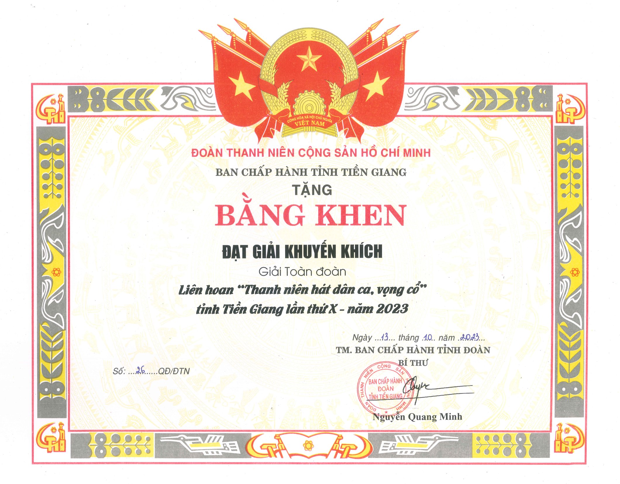 Đạt giải Khuyến Khích toàn đoàn Liên hoan Thanh niên hát dân ca, vọng cổ tỉnh Tiền Giang lần thứ X - năm 2023