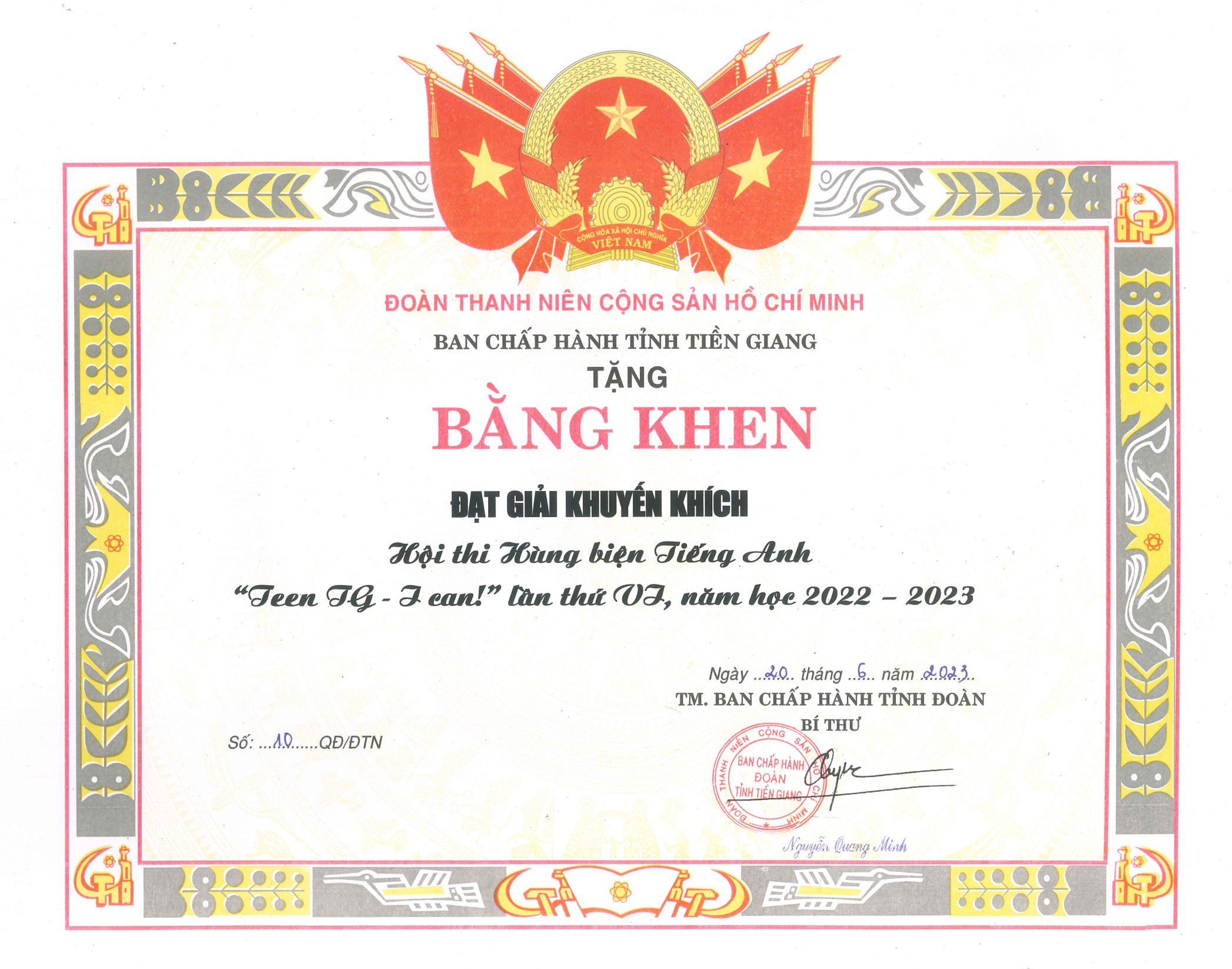 Đạt giải Khuyến Khích Hội thi Hùng biện tiếng Anh Teen TG - I can! Lần thứ VI, năm học 2022 - 2023