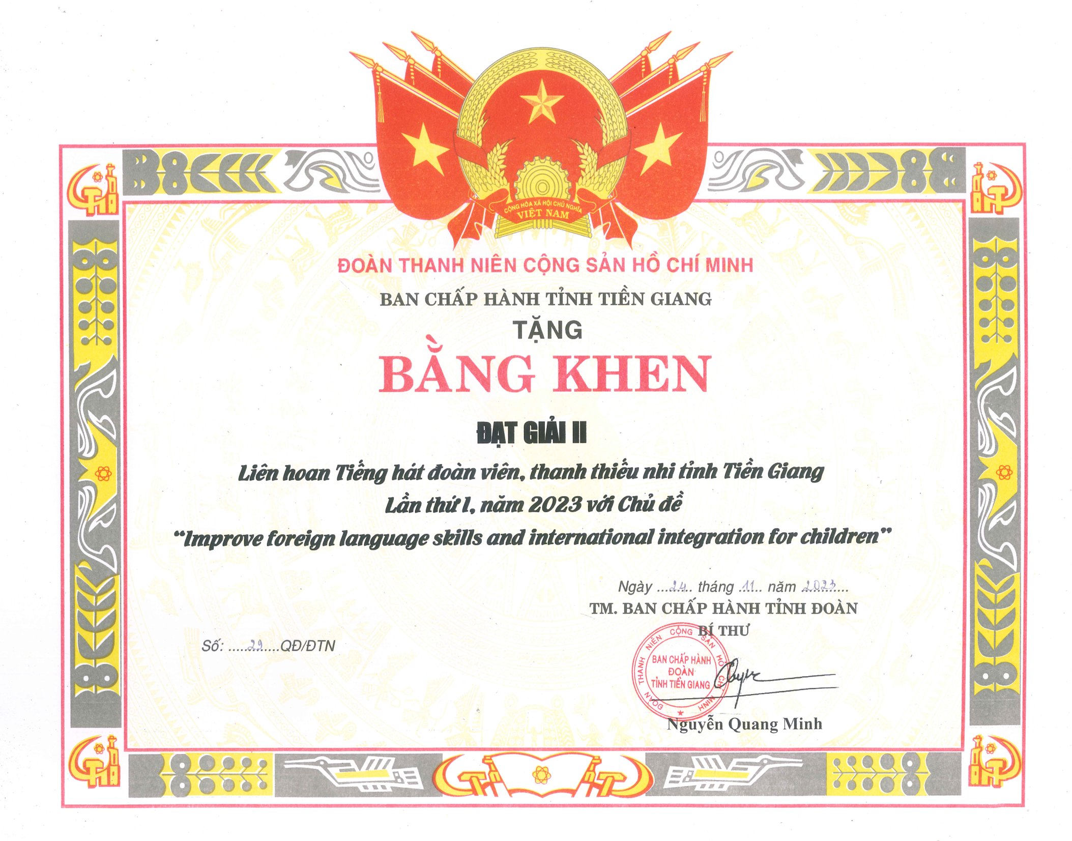 Đạt giải II Liên hoan Tiếng hát đoàn viên, thanh thiếu nhi tỉnh Tiền Giang Lần thứ I, năm 2023 với chủ đề Improve foreign language skills and internaltional integration for children