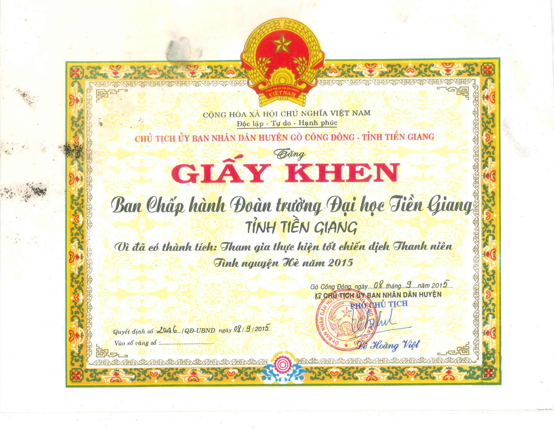 Giấy khen Chủ tịch Ủy ban Nhân dân huyện Gò Công Đông - tỉnh Tiền Giang năm 2015